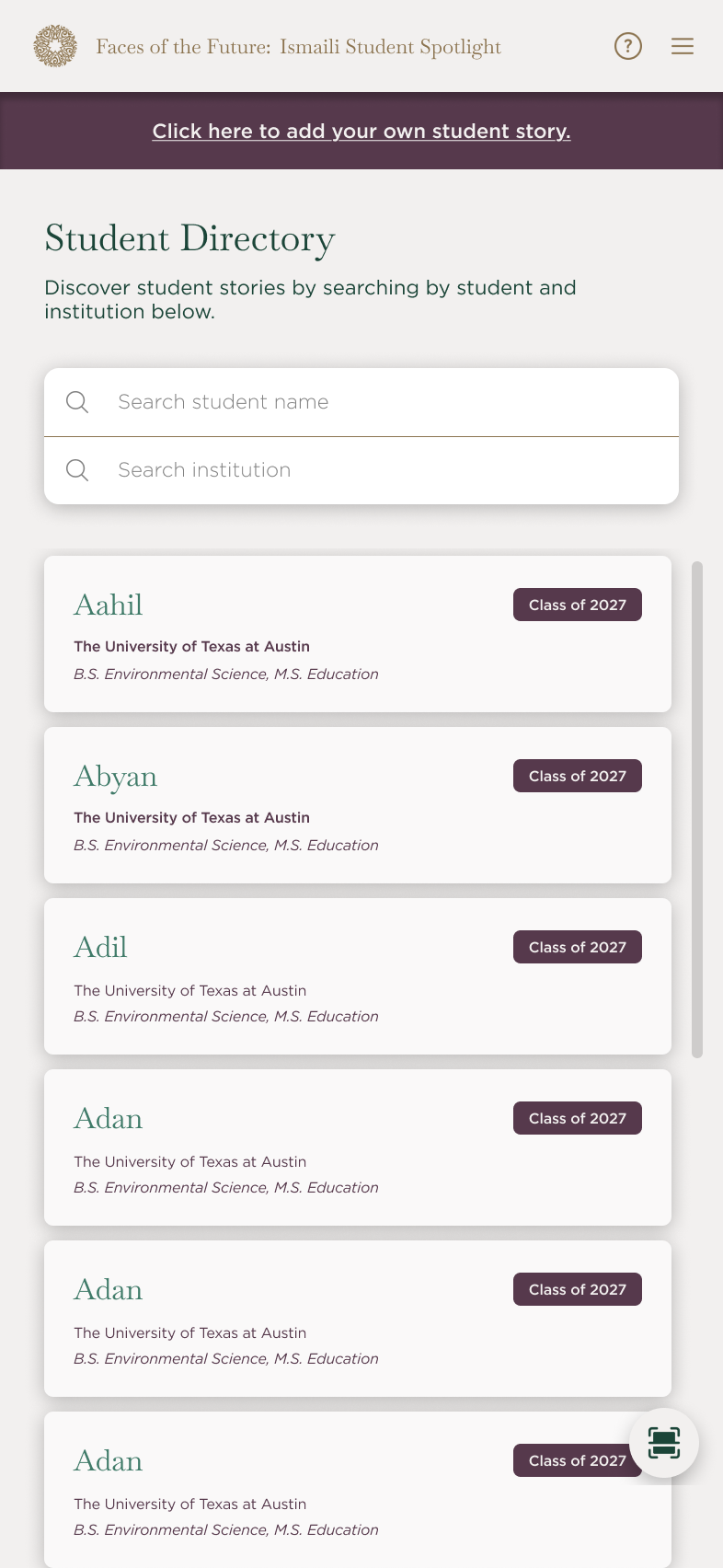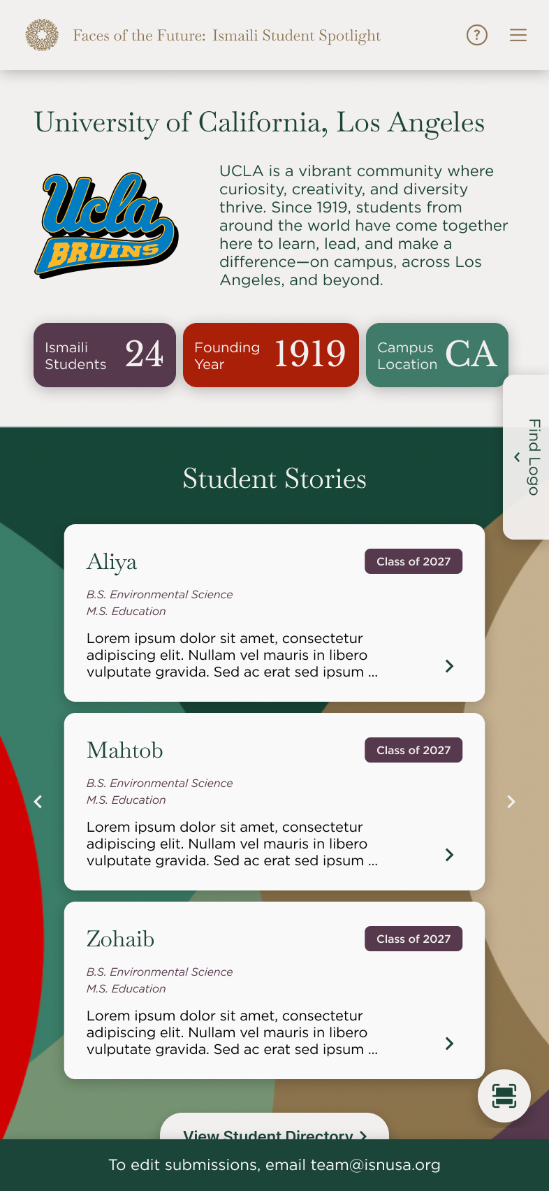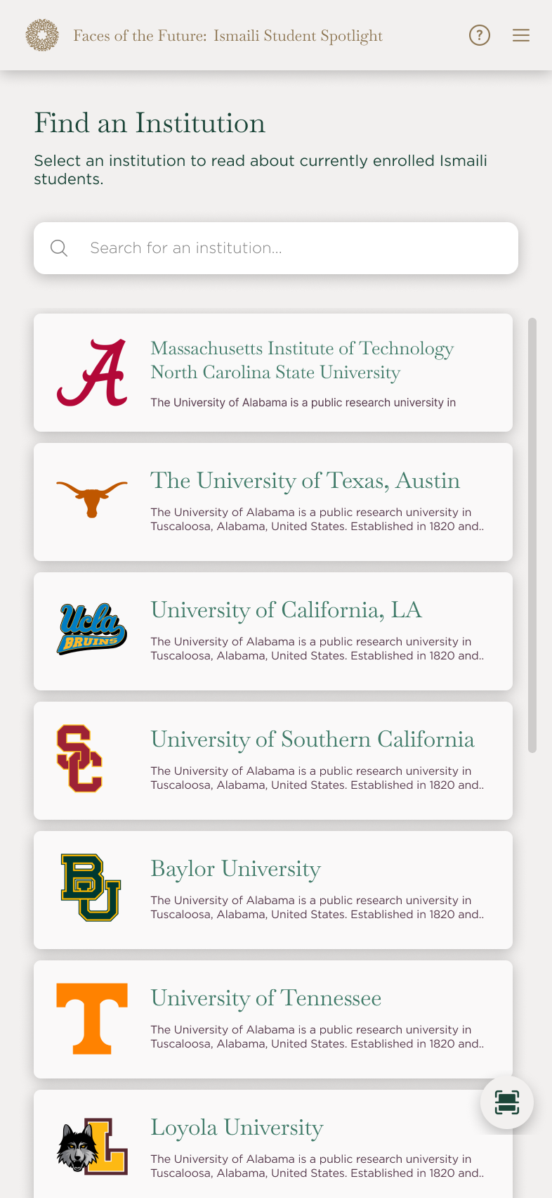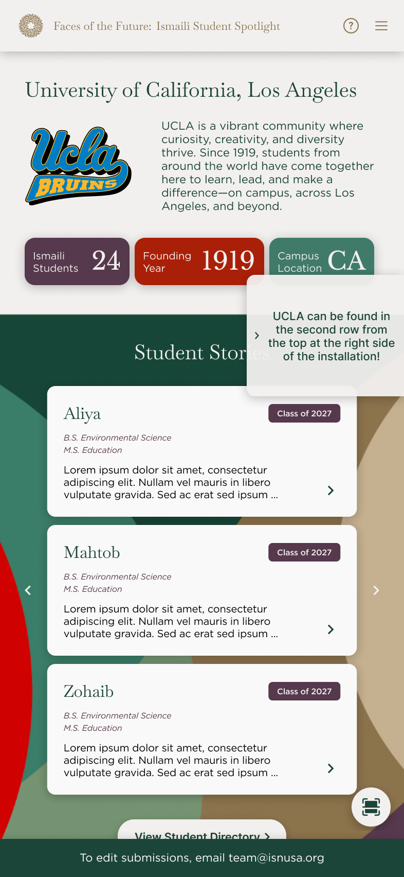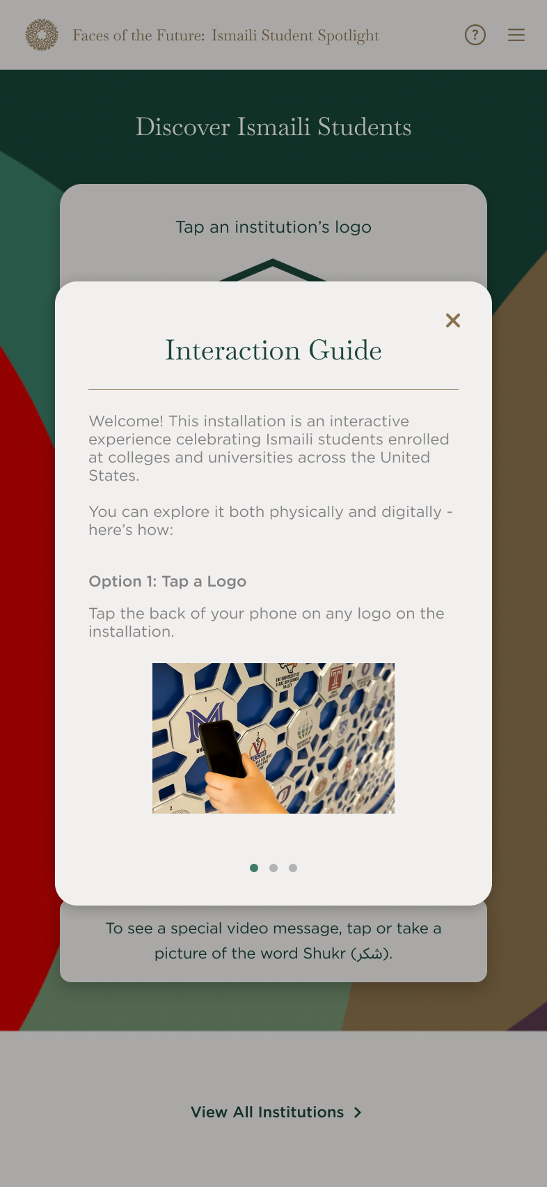 Designed an interactive, location-based mobile experience for the Ismaili Muslim community that celebrated and showcased current college students across institutions. The project transformed a physical art installation featuring the word “Shukar” (Arabic for thanks) into a digital storytelling platform, allowing users to tap on college logos to unlock student profiles, stories, and institutional representation. The experience was intentionally designed to be intuitive and accessible for users of all ages, prioritizing inclusivity and equitable representation while fostering excitement and pride. By blending physical space with digital interaction, the project highlighted the collective intelligence, diversity, and achievements of the current student population through a shared community experience.